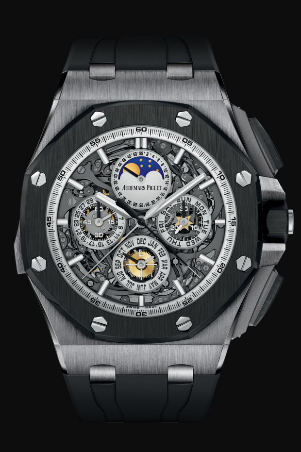 Dans un registre très proche, Audemars Piguet a également présente sa propre Grande Complication. Sa particularité est d’avoir comme écrin une Royal Oak Offshore. Les initiés attendaient cette réalisation, la Offshore étant la seule pièce à n’avoir jamais reçu de tels honneurs. En l’occurrence, le mouvement mécanique automatique associe une répétition minutes, un chronographe à rattrapante et un QP, le tout pour un total de 648 composants au sein d’un boitier fort raisonnable de 44 mm. Chaque pièce requiert 820 heures de travail. Là aussi, 6 pièces seront produites en différentes finitions.