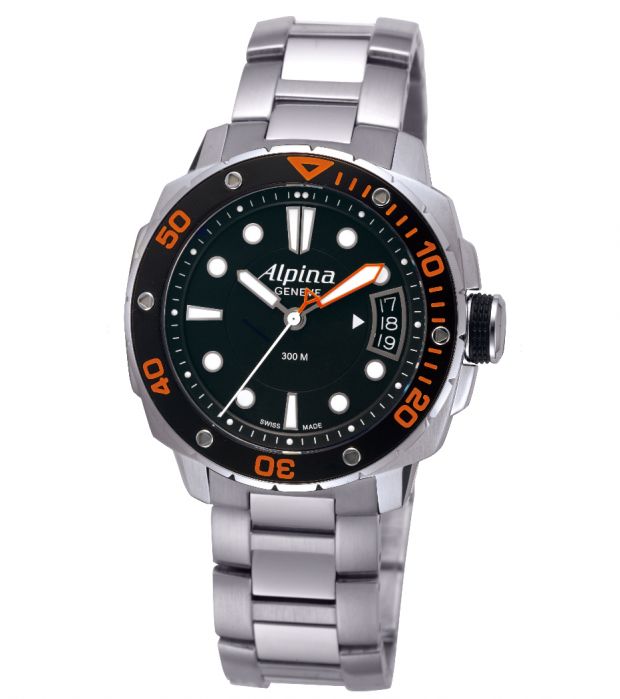 Ponctuée d’orange pour une lisibilité absolue dans n’importe quel milieu aquatique, cette nouvelle Alpina est dotée de tous les attributs nécessaires pour évoluer à 300 mètres sous les mers. Graduée en orange luminescent, la lunette tournante unidirectionnelle de 60 minutes, complétée d’une aiguille des minutes blanche bordée d’un liseré orange vif et d’index lumineux, informe, lisiblement et en toute sécurité, du temps d’immersion restant.