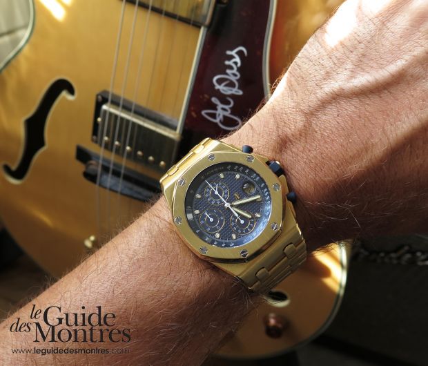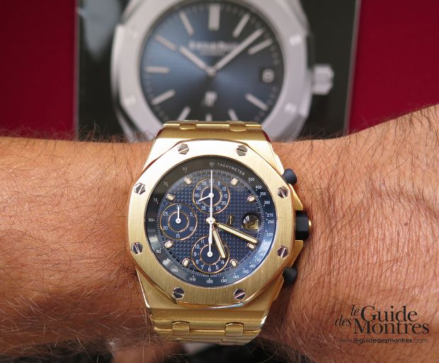 Aujourd’hui, nous avons décidé de passer au poignet la mythique Royal Oak Offshore (42 mm) dans une version dite « full gold » et le poids s’en ressent puisque ce n’est pas moins de 370 grammes au poignet, soit plus de 2 fois le poids d’une Royal Oak ref. 15400 en acier (165g).