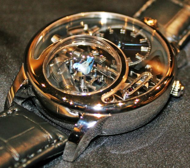 Côté Hublot, c’est, comme d’habitude, l’abondance voire la surabondance de nouveautés. On retiendra surtout la Master Piece 05, MP-05 « LaFerrari ». Inspirée de la Enzo, cette pièce cumule 11 barillets et offre 50 jours de réserve de marche, un record absolu dans l’horlogerie (à date !). Un tourbillon complète l’ensemble, dissimulé sous le cadran et visible uniquement par un…hublot, à l’extrémité de la pièce. L’exclusivité a toutefois un prix : environ 250.000 € pour 50 exemplaires. Alors que la MP-04 Clé du Temps se distinguait surtout par son absence totale de poésie et d’esthétique, coiffée au poteau par la sublime Temps Suspendu d’Hermès sur le même registre, la MP-05 témoigne d’une audace technique et esthétique à couper le souffle.