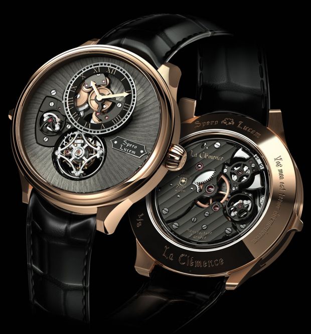 A l’extrême opposé, Spero Lucem offre deux garde-temps, dont un, la Clémence, comporte un tourbillon volant et une répétition minute à aiguilles folles. Une nouvelle complication horlogère ? Disons simplement une énième facétie d’Arpa : à chaque déclenchement de la répétition minute, les aiguilles s’affolent dans tous les sens, obligeant le propriétaire à écouter la mélodie pour connaître l’heure. Une fois celle-ci terminée, les aiguilles reprennent sagement leur place. Ludique, rafraichissant, et témoignant en même temps d’une maîtrise technique hors norme : voilà probablement l’un des visages de l’horlogerie de demain.