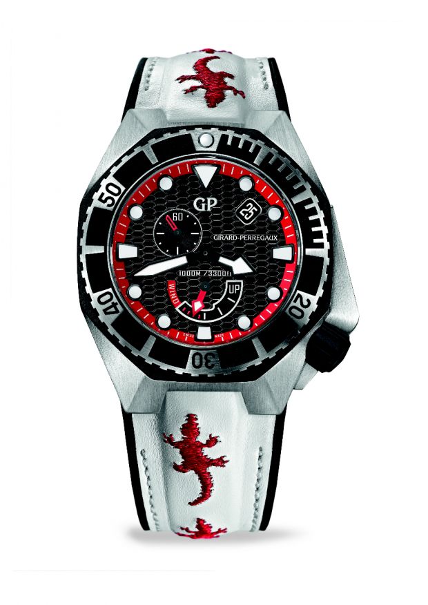 Girard Perregaux sort une nouvelle ligne ainsi qu’un nouveau modèle. La nouvelle ligne, c’est la Hawk, une nouvelle collection de montres de sport comprenant la Sea Hawk et la Chrono Hawk. Elle réinterprète l’octogone du modèle Laureato. La première, la Sea Hawk, est garantie étanche jusqu’à 1000 mètres et possède une valve à hélium. Des modèles sports bienvenus chez GP mais dont on recherche encore l’originalité, voire l’intérêt… Prix : de 10.000 à 12.000 euros. Paradoxalement, c’est peut-être le modèle développé exclusivement en série limité pour la Miami Art Week qui est le plus attirant avec son crocodile rouge et son réhaut de lunette de la même couleur.