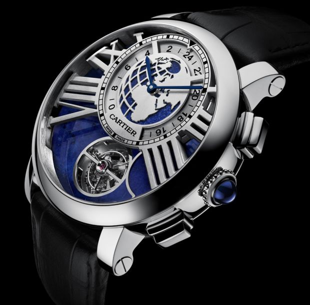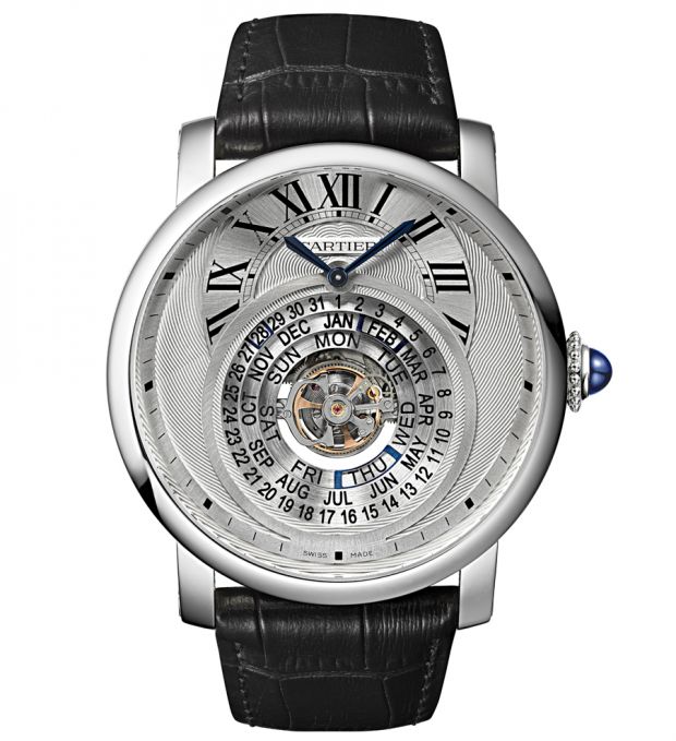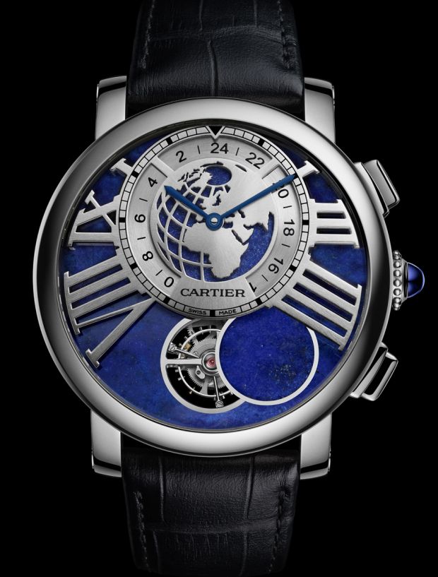 Autre complication à l’ordre du jour, un tourbillon phase de Lune, avec une pièce intitulée la Rotonde Terre et Lune. Le mécanisme de phase de Lune repose sur une conception complexe et créative qui allie tourbillon, phases de lune à la demande et second fuseau. En actionnant le poussoir situé à quatre heures sur le côté du boîtier, un cache descend et occulte partiellement la cage de tourbillon. Le croissant ainsi dessiné reproduit exactement celui que la lune trace dans le ciel. Le second fuseau repose quant à lui sur un système de disque, plus conventionnel mais néanmoins inédit jusqu’à ce jour chez Cartier.