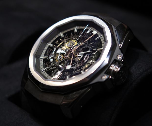 Dans cette AC-One, le squelettage laisse apparaitre la totalité du mouvement avec un accent particulier mis sur le disque de date ouvert par un guichet à six heures. Dans son boîtier de 45 mm, la pièce impose une signature esthétique marquée mais dont la faible lisibilité pourra freiner quelques ardeurs.