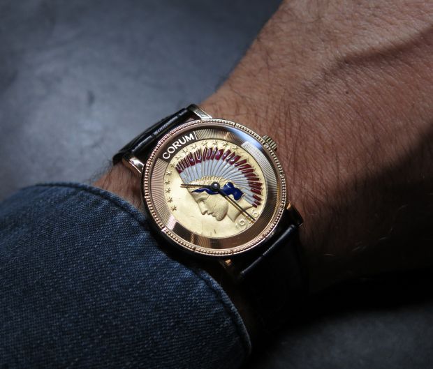 La pièce proposée en 2014 par Corum est en tous points conforme à l’originale : sobre diamètre de 39 mm, boîtier or, deux aiguilles, mouvement automatique et rien de plus. On apprécie autant l’hommage cohérent avec la pièce originale que le soin apporté à la préservation d’un métier d’art devenu rarissime.