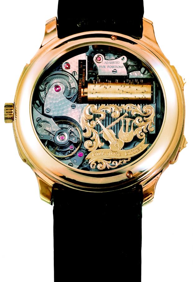 Ce type de complication n’est pas nouveau. Dès 1995, Christophe Claret – encore – avait créé une montre musicale. Ce n’était pas à proprement parler une répétition minutes, mais elle permettait, à la demande, de faire entendre deux airs au choix mis en musique par un clavier à 20 lames vibrantes. Nous étions toutefois dans l’optique d’une boîte à musique traditionnelle transposée en montre-bracelet, donc différente de l’Acoustica.