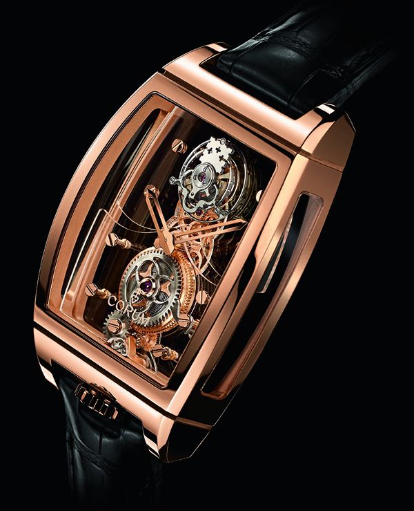 Pour les fins connaisseurs, mouvement baguette = Corum. C’est la ligne Golden Bridge qui, plus précisément, hérite de cette belle mise en scène horlogère. Aujourd’hui, la Golden Bridge voit son mouvement baguette agrémenté d’un tourbillon.