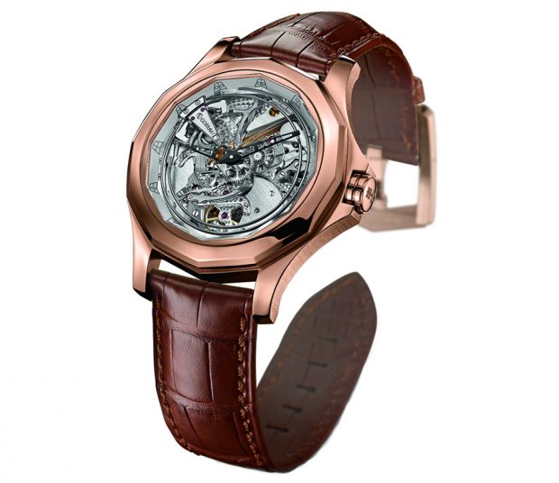 La part belle horlogère est consacrée à la Ti-Bridge, présentée en diverses et rares éditions, à l’exemple d’un modèle à fond orangé inédit. A ses côtés, on découvre le très beau modèle à masse linéaire en platine (45.700 euros), une véritable pièce d’architecture montée sur le célèbre mouvement baguette créé par Vincent Calabrese il y a 30 ans.