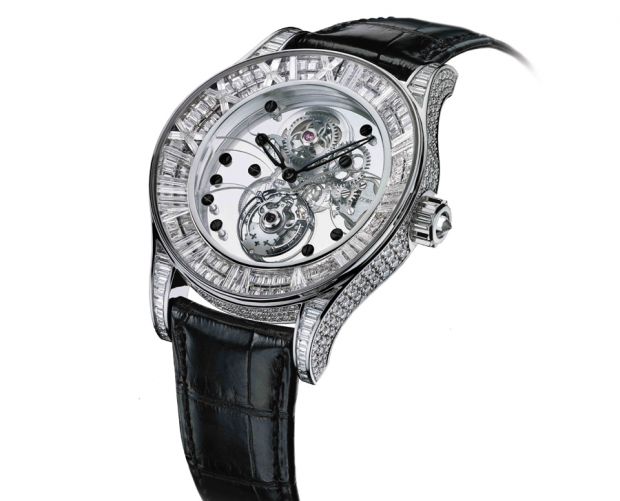 Côté haute joaillerie, on trouve aussi chez Dubail la non moins rare Romulus BIllionnaire Tourbillon, dans deux versions (index diamants ou diamants noirs). D’un généreux 45 mm, elle n’est éditée qu’en cinq exemplaires et offre, autre particularité, une impressionnante réserve de marque de 90 heures. Prix : 384 500 euros.