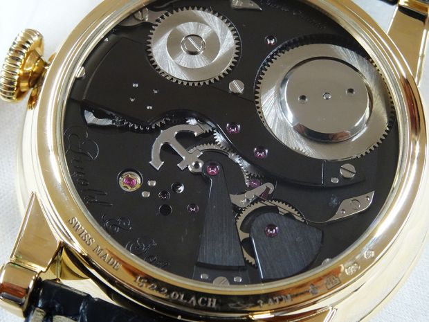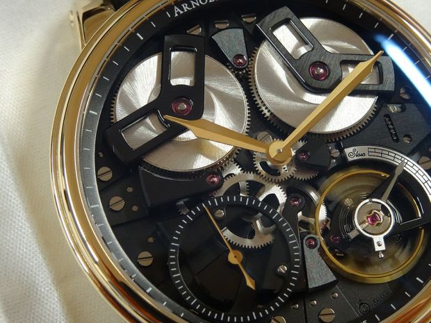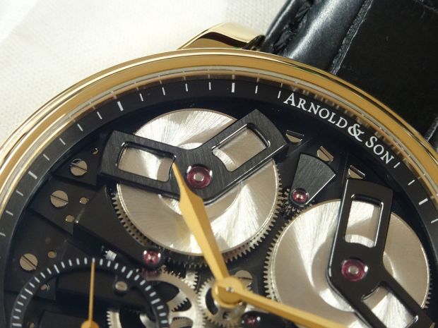 L’œil expert n’aura pas manqué de noter l’abondance de ponts. C’est un parti pris d’Arnold & Son, une référence historique assumée. En effet, la grande tradition horlogère assigne, par défaut, un pont par fonction. Pour des raisons pratiques comme économiques, la majorité des garde-temps actuels préfère les platines, ces vastes plaques recouvrantes qui viennent supporter à elles seules l’échappement, le train de rouage primaire, voire le barillet ou même le chronographe. La fameuse « platine trois quarts » de Glashütte est même devenue la signature des montres de cette ville, comme A. Lange & Söhne ou Glashütte Original.