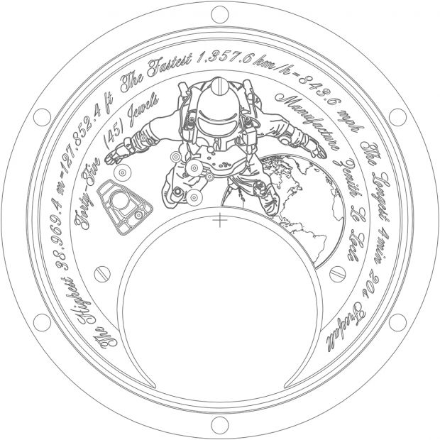 En dehors de ce registre esthétique, la pièce n’est donc pas une nouveauté. Ces mentions sont complétées d’une gravure qui illustre la célèbre photo de l’homme s’apprêtant à sauter de la capsule arrivée à son altitude maximale. Habillant le cadran de la réserve de marche à 3h, le personnage en combinaison spatiale est gravé sur une plaque d’or vissée sur le cadran par deux vis, l’une au-dessus du casque, l’autre sous le pied gauche. A 12h, le cadran recèle un détail amusant : un léger trait, dessiné entre le chiffre 12 et le premier index, discrète évocation de la durée du saut (4 minutes et 20 secondes).