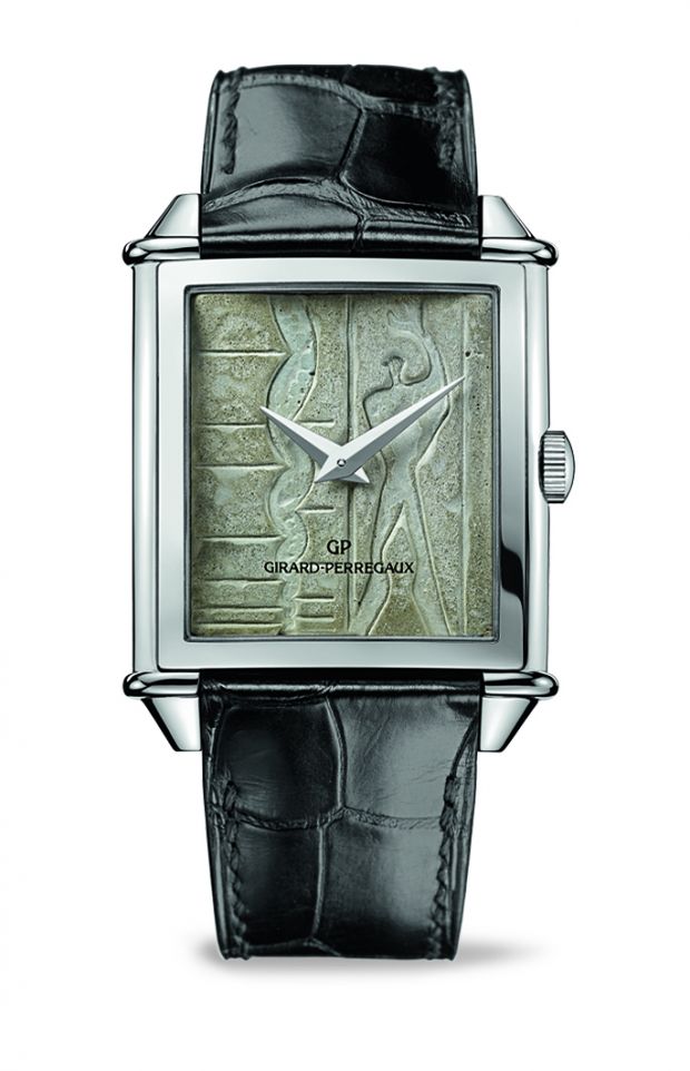 Si le verre (saphir) et l’acier sont devenus des éléments courant de l’horlogerie, c’est bien évidemment la pièce en béton qui retient ici l’attention. Girard-Perregaux a ainsi développé un cadran en béton nécessitant trois jours de travail pour être coulé, séché et terminé à la main.