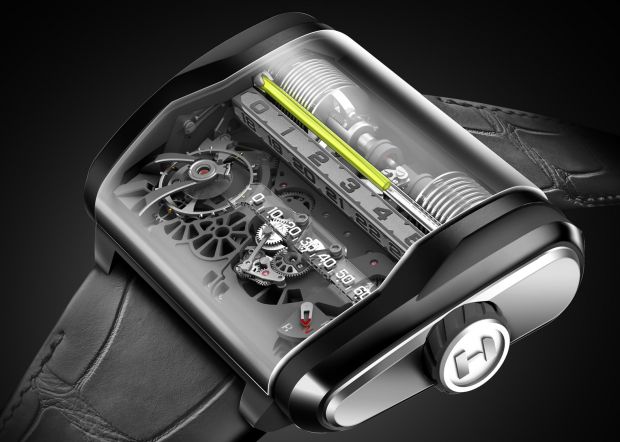 Juste en dessous, un capillaire empli du désormais célébré fluide vert. A son autre extrémité réside toujours un fluide translucide. Entre les deux, un ménisque a pour responsabilité de les dissocier. En dessous, une barre horaire centrale garnie de six satellites, gravés sur chacune de leur face de quatre heures. Le fluide vert indique au fil de sa progression sur lequel de ces cubes l’heure doit être lue. Le dispositif est complété d’un affichage rétrograde des minutes, en bas de la pièce. Sur l’exemple proposé par HYT, on peut donc lire qu’il est 4h50.