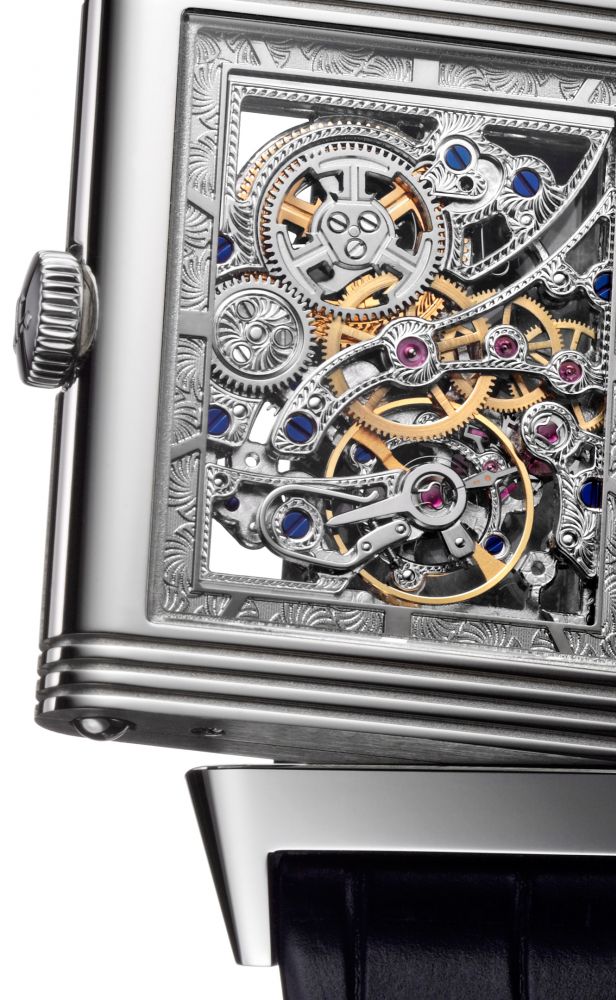 Côté Reverso, la 1931 Rouge et sa sœur sur email bleu font leur entrée en modèle boutique et limité (134 pièces), alors qu’une Grande Reverso squellette voit le jour sous la référence Ultra Thin SQ.