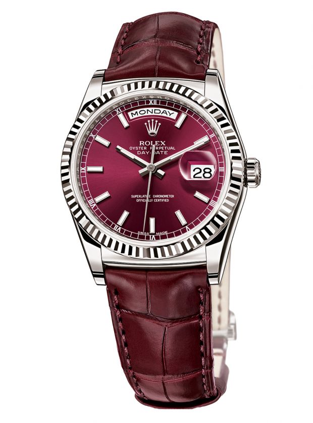 Enfin, la croissance des diamètres des boites ayant profondément modifié la perception des proportions, la Day Date 36 mm semble toute indiquée pour les femmes. On se rangerait volontiers derrière cet avis si Rolex ne proposait pas cette nouvelle nuance cerise, presque griotte relevait un confrère. Paré un d’un bracelet croco mat de la même teinte, avouons le, l’ensemble est hypnotique. Le risque était grand, car la teinte n’est pas aussi simple à manier qu’un rouge classique. Nous n’avons pas résisté à l’envie de la passer au poignet. Les 36 mm occupent l’espace, pas d’anachronisme. Pour il, pour elle, nous n’avons pas réussi à trancher. Mais pour les deux, certainement.
