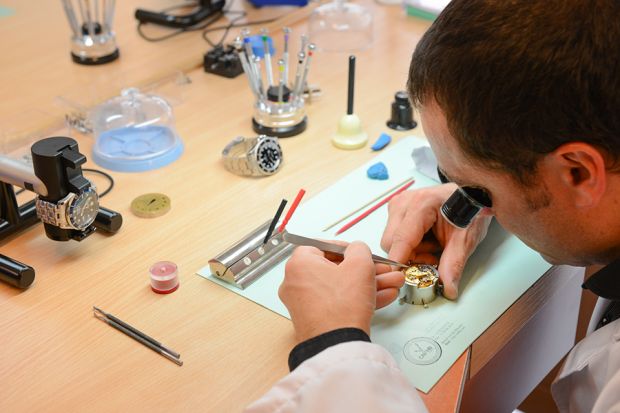 L’atelier horloger, composé de 5 personnes est en charge du service avant-vente pour expertiser et préparer les montres qui seront vendues en boutiques : contrôle, authenticité et traçabilité totale, garantie… mais aussi du service après-vente pour effectuer des opérations d’entretien et de réparation de montres et de pièces horlogères. 350 à 400 montres y transitent chaque mois !
