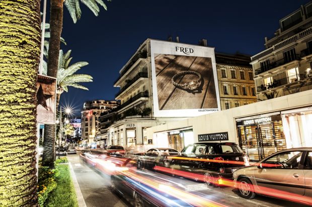 La Haute Joaillerie n’est pas en reste et lui emboîte le pas, toujours en grand format, avec Fred qui s’offre une toile de 230m2 sur la Croisette au coeur de Cannes.