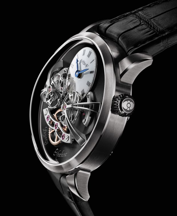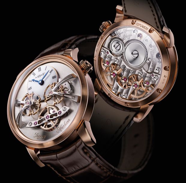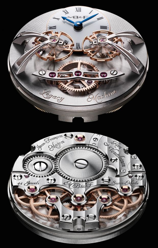Les arches des balanciers portent littéralement la pièce. Le sublime travail esthétique d’Eric Giroud, designer quasi-exclusif de toutes les MB&F, se marie avec la finition opérée par Kari Voutilainen, horloger indépendant déjà à l’origine de la LM1. On note par exemple le soleillage du « cadran », qui est en réalité la platine du mouvement. Le verre saphir « dôme » était lui aussi présent sur la LM1 et devient la marque de fabrique de la série. Côté mouvements, finitions irréprochables, gravures à la main, cotes de Genève : c’est la cour des grands.