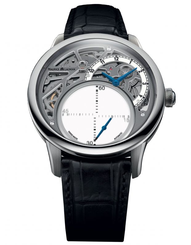Maurice Lacroix, manufacture fondée en 1975, est l’auteur de cette pièce remarquée qui allie une architecture de type squelette à une complication additionnelle atypique, portant sur l’aiguille des secondes.
