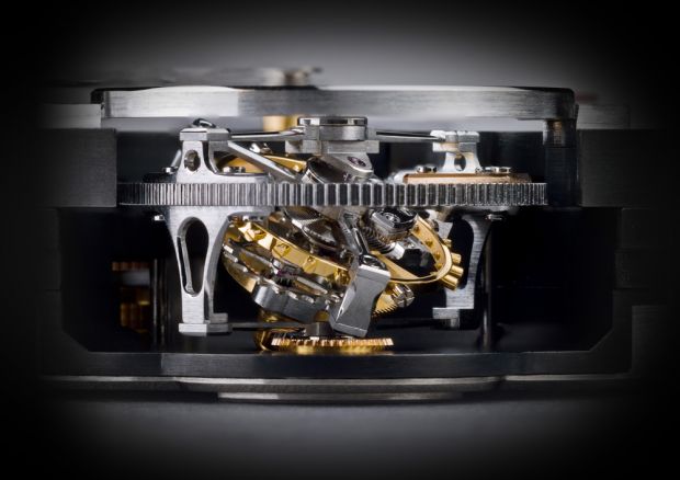 La construction du mouvement a été entièrement repensée, avec une conception différente de la cage extérieure du Double Tourbillon 30° breveté qui a été retournée. Toutefois, les rotations en 1 minute de la cage intérieure et en 4 minutes de la cage extérieure ont été conservées. Le mouvement de ce garde-temps est logé dans un boîtier de 43,5 mm, boîtier muni d’une fenêtre latérale à 8 heures. Cette ouverture offre à l’observateur une vision du mécanisme sous un angle particulier, vitrine sur la complexité et l’esthétisme de cette complication unique. Le traitement noir du logement du tourbillon et de la platine accentue encore l’effet de profondeur de la double cage, composée de 130 éléments.