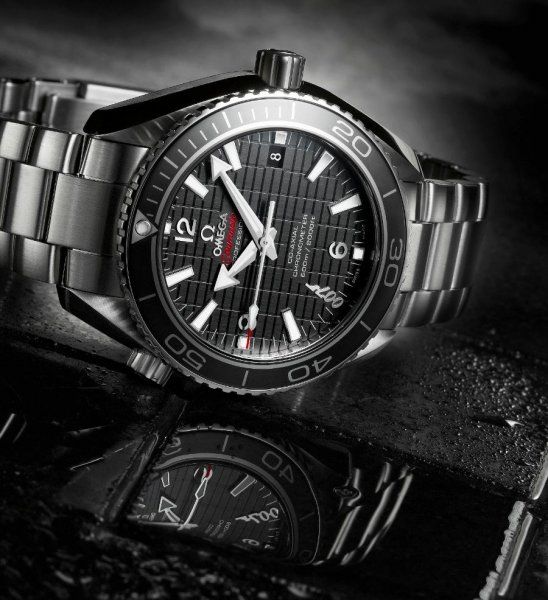 Sur base d’une Omega Seamaster Planet Ocean, Omega a travaillé sur une version noire du plus bel effet, jouant sur le contraste entre matériaux brillants et mats. Comme tout modèle de cette gamme, elle est dotée d’une lunette tournante unidirectionnelle et d’une soupape hélium, la montre étant étanche à 60 bar soit 600 mètres – a priori suffisant pour le commun des mortels, mais à discuter pour 007…
