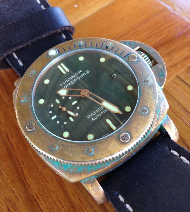 Et bien que notre époque rivalise d’innovation dans l’emploi de matériaux toujours plus originaux, Panerai, qui a également utilisé le DLC ou le composite (Radiomir Marina Militare-PAM00339-dont la cote surpasse aussi le prix du neuf), a porté ici son choix sur un matériau « antique », qui s’inspire du monde nautique, dont certaines pièces d’anciens voiliers était en bronze.