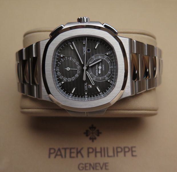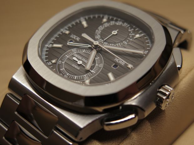 Les deux poussoirs permettant de régler l’aiguille de l’heure locale vers l’avant ou vers l’arrière, par crans d’une heure, s’intègrent dans le flanc du boîtier, à 9h, de manière à ce que la montre conserve le fameux design Nautilus inspiré d’un hublot.