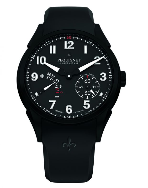 Côté cadran, outre heures et minutes, on retrouve une petite seconde décentrée à quatre heures, ainsi qu’un quantième de jour et de date, complétés par une réserve de marche indiquant les 88 heures d’autonomie de la pièce. Ce sont là les caractéristiques essentielles du Calibre Royal, mouvement emblématique – et manufacturé – de Pequignet. L’ensemble prend place dans un boitier de 44 mm en titane, décliné en cadran anthracite, blanc, marron (soleillé) ou noir, pour des prix de 5000 à 6500 euros.