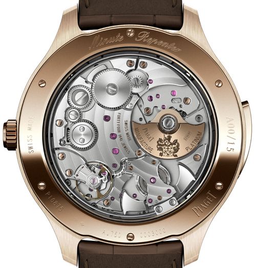 Piaget reste le plus fidèle à ce que ses fans attendent de la marque : l’ultra-plat. La manufacture détient déjà l’un des plus beaux palmarès de records et brevets en la matière. Pour autant, l’exercice de la répétition minute est délicat à enfermer dans un boitier ultra-plat, pour deux raisons. La première tient tout simplement au nombre de composants. Dans la dernière création de Piaget, que l’on verra dans quelques jours à Genève, ils sont au nombre de 407. La seconde raison est acoustique : plus le volume de la boîte, qui sert de caisse de résonnance, est restreint, plus le son qui en sort est ‘étriqué’. Le risque est donc de réaliser une répétition minute ultra-plate, mais aphone.