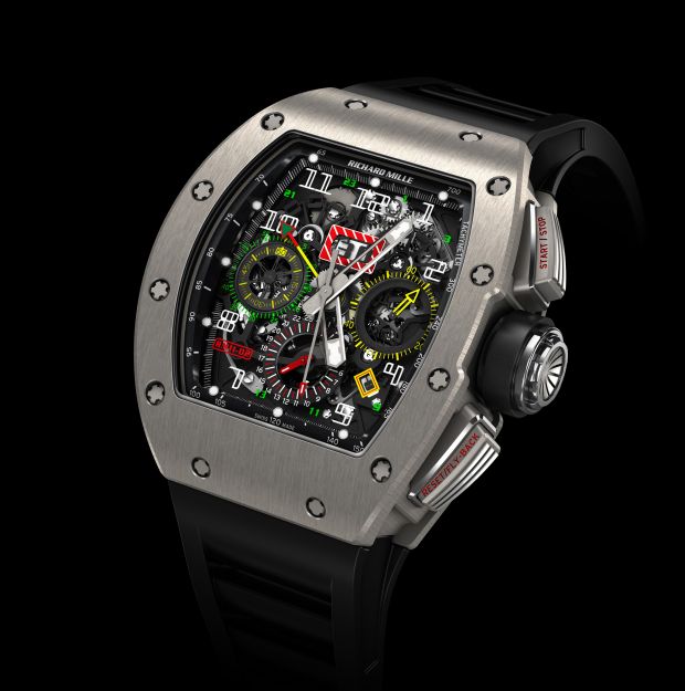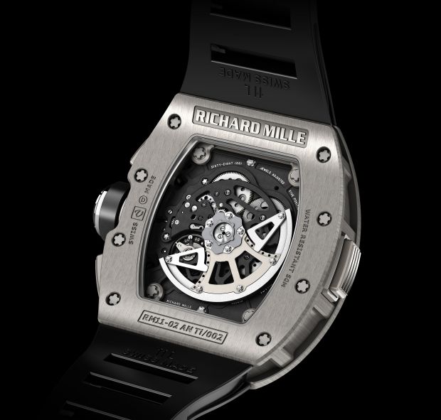 Le calibre automatique de la RM 11-02 constitue le prolongement technique de la RM 011. Outre les fonctions chronographe flyback, quantième annuel avec date surdimensionnée, compte à rebours 60 minutes et totaliseur 24 heures, la RM 11-02 possède un affichage UTC pour la lecture d’un second fuseau horaire via une aiguille revêtue de Super-LumiNova.