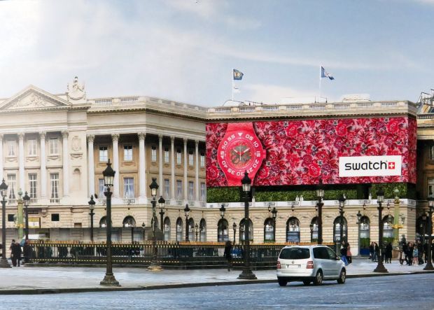 Voici le visuel prévu initialement sur la nouvelle toile publicitaire de la marque Swatch sur la Place de la Concorde, à Paris.