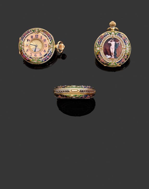 Montre de poche demi-savonnette en or jaune émaillée avec répétition minutes pour le marché indien.