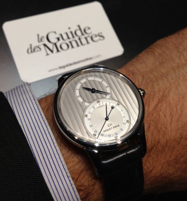 L’autre point, c’est le traitement du cadran. C’est une surface qui semble plane, mais qui ne l’est pas. On pense à un papier grainé, de type Cansson. Une sorte de micro billage qui apprivoise la lumière. Décliné cette année en deux autres teintes, marine et chocolat, pas desagréables.