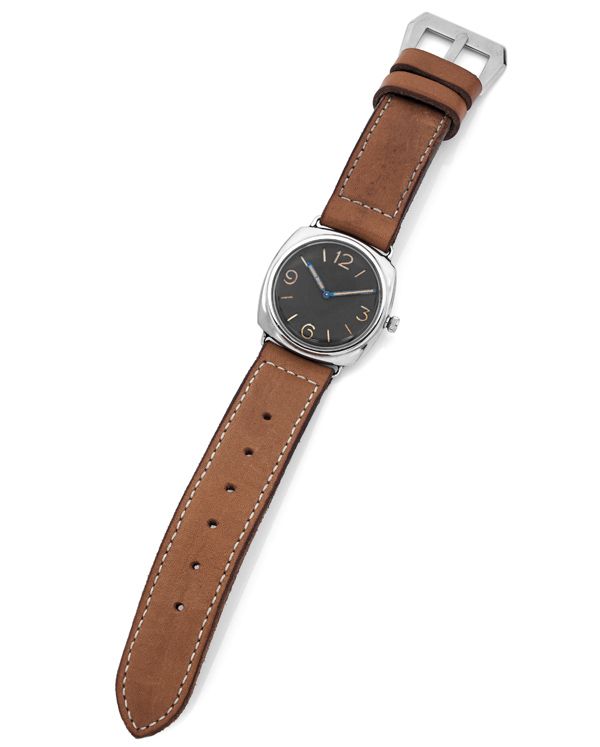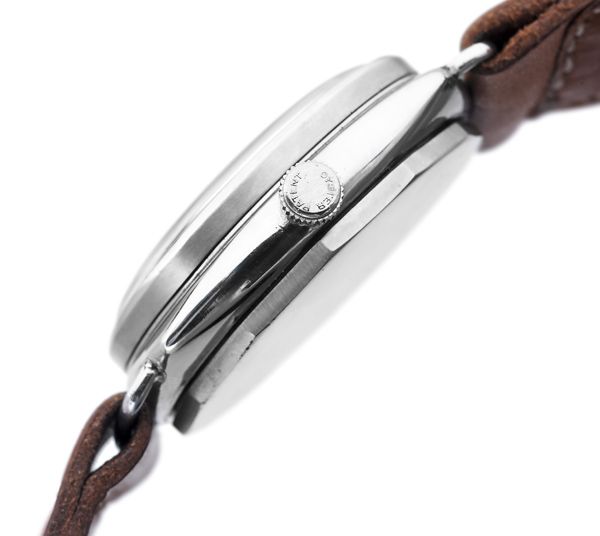 Il s’agit donc d’une rarissime et superbe montre bracelet de plongée fabriquée pour les commandos de marine Italiens en acier. Son boîtier est de forme coussin, avec couronne et fond vissé. Son cadran « sandwich » noir avec index et chiffres arabes préfigure ce que sera le design définitif des Panerai modernes, avec aiguilles squelette en acier bleui.