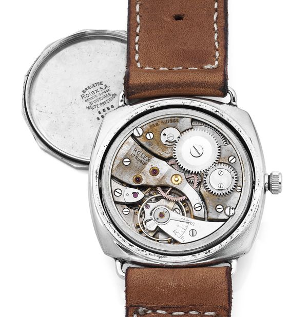 Le mouvement mécanique calibre 618 signé Rolex est bien entendu la particularité de cette pièce. D’origine, il comporte les mentions « Brevetée Rolex S.A. – Genève – Suisse – 31 victoires haute précision ». Le cadran est vierge de toute inscription, et comme le veut l’usage à l’époque, le « Swiss Made » n’apparaît pas, au profit de la simple mention « Fab. Suisse » directement inscrite sur le mouvement. D’une généreuse dimension de 47 x 47 mm, la pièce est estimée entre 80.000 et 120.000 euros.