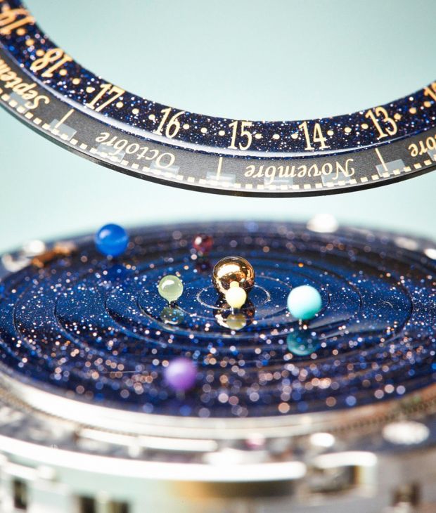Pour cette édition du SIHH 2014 , Van Cleef & Arpels capture le ciel dans les proportions d’une montre de poignet. Six ans après le lancement du modèle Lady Arpels Jour Nuit, elle célèbre ainsi de nouveau le ciel en s’inspirant de la tradition historique des planétaires.