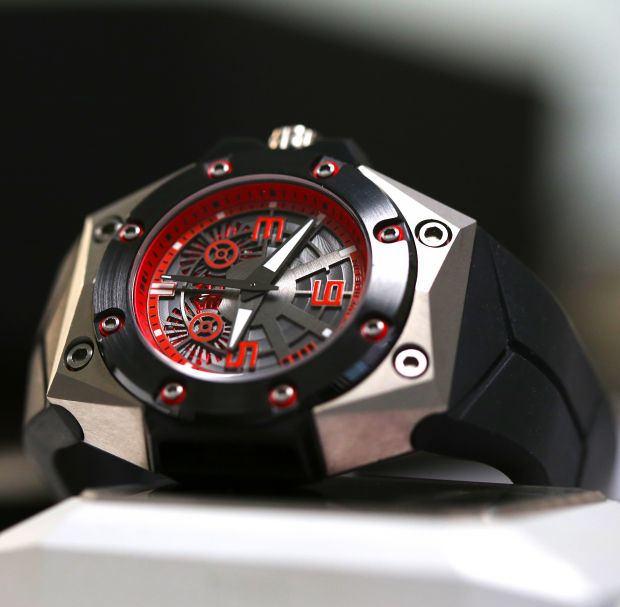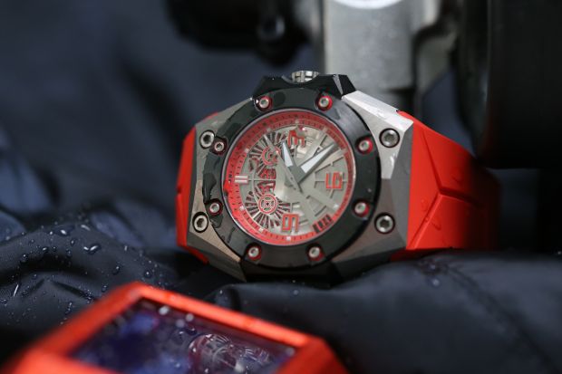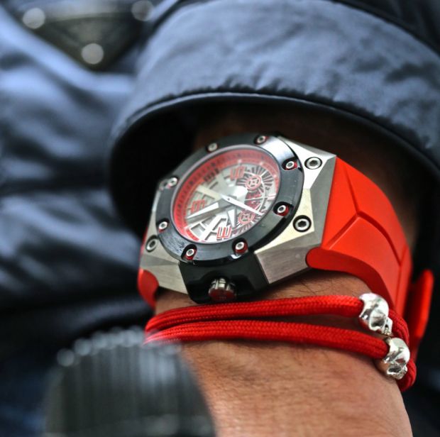 Ce bracelet caoutchouc rouge allié à l’imposante boîte titane font de l’Oktopus une pièce résolument non consensuelle. Impossible donc de la porter dans un cadre professionnel trop corporate. A l’inverse, la pièce sera parfaitement à son aise à la plage, voir à 300 mètres de profondeur, son seuil maximum d’étanchéité.