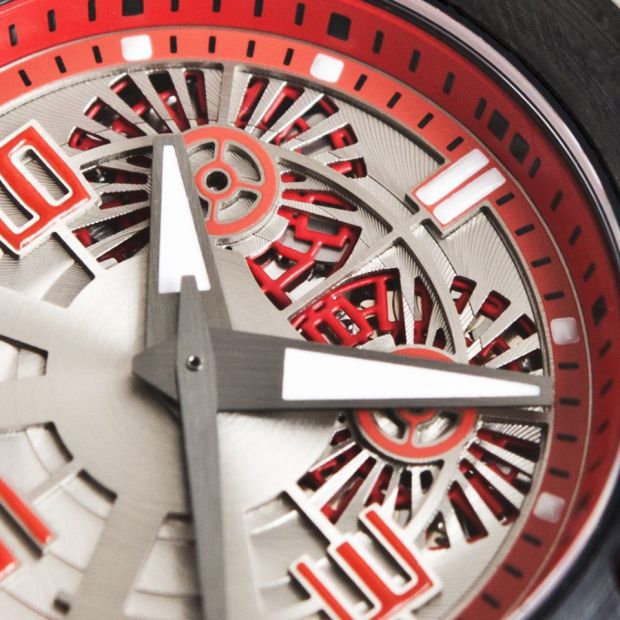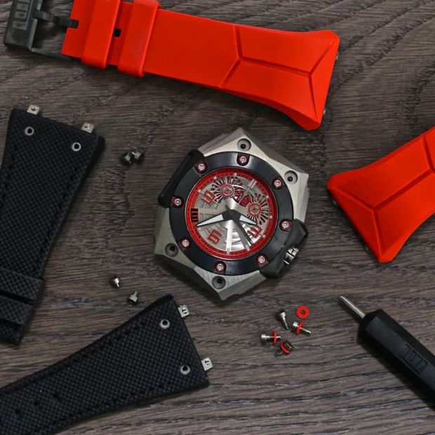 Avec ses trois couleurs principales que sont le noir, le gris et le rouge, cette Oktopus II affiche une signature esthétique forte qui ne lui permettra pas de se fondre en toutes circonstances. Cela dit, tel n’est probablement pas son objectif. La montre se positionne davantage comme une sportive affirmée, capable en parallèle de composer avec un quotidien urbain.